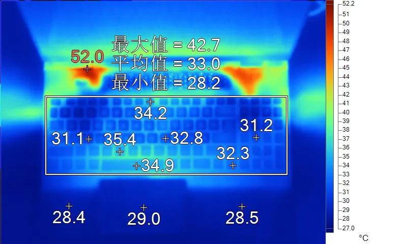 表面温度如上图所示,键盘键帽最高35.4℃出现在“V”键上,WASD键附近约为31.1℃,方向键32.3℃。左腕托温度为28.4℃。