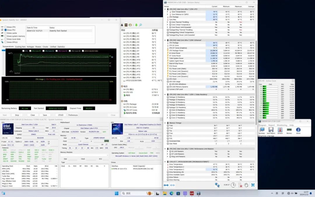 在满载状态下,开启性能模式,CPU温度最高97℃,稳定在84℃,功耗23W,P核频率维持在1.9~2.0GHz,E核频率1.1GHz,LPE核1.1GHz。
