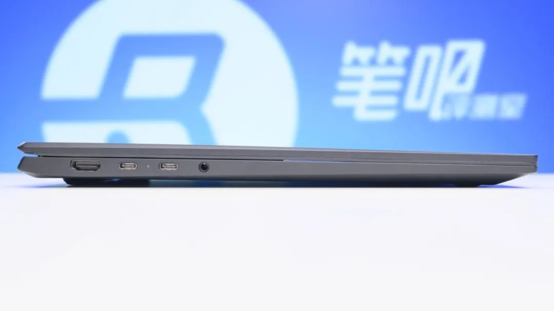 接口方面,机身左侧依次为HDMI2.0、两个雷电4接口(支持PD充电与DP1.4视频输出)、3.5mm音频接口;