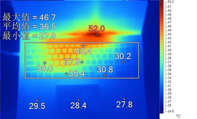 表面温度如上图所示,键盘键帽最高43.4℃出现在功能键“F10”上,WASD键为38.0℃,方向键30.8℃。左腕托温度为29.5℃,背面中心点28.4℃。