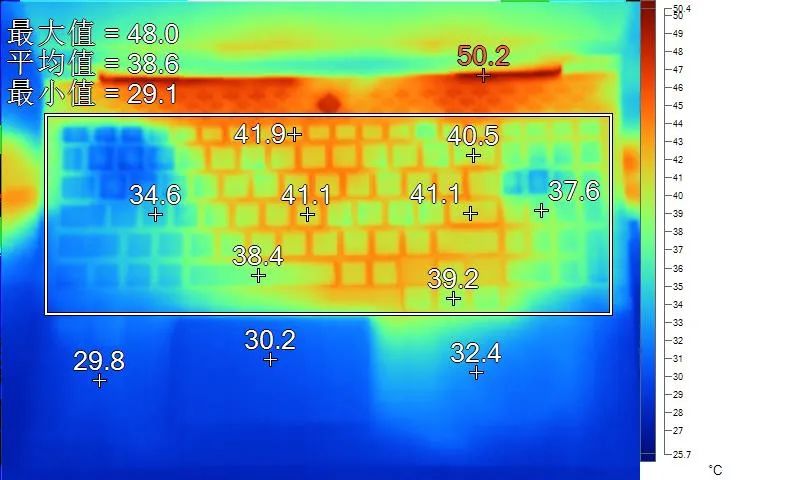 表面温度如上图所示,键盘键帽最高41.9℃出现在“F8”键上,WASD键附近约为34.6℃,方向键39.2℃。左腕托温度为29.8℃。