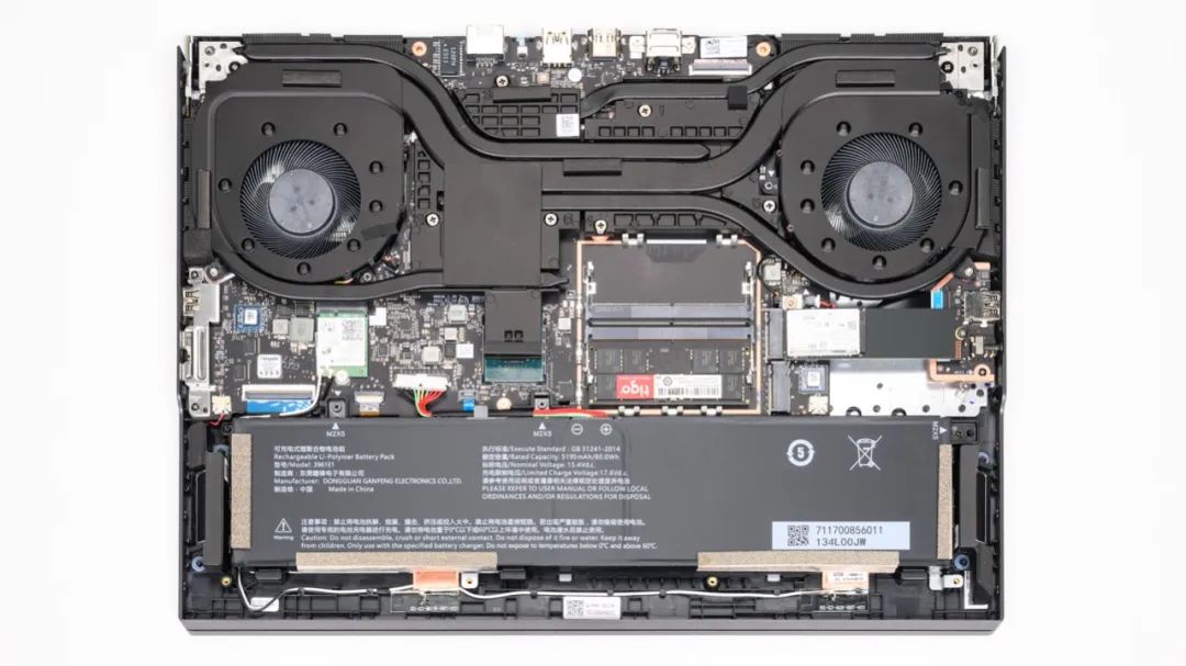 上图是机械师 曙光16的拆机实拍图, 五热管双风扇的组合。