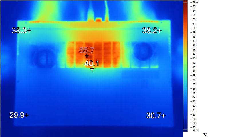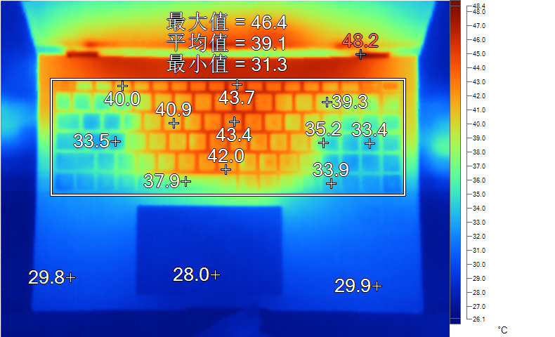 表面温度如上图所示,键盘键帽最高43.7℃出现在“F9”键上,为,WASD键附近约为33.5℃,方向键33.9℃。左腕托温度为29.8℃,背面中心点温度为40.1℃。