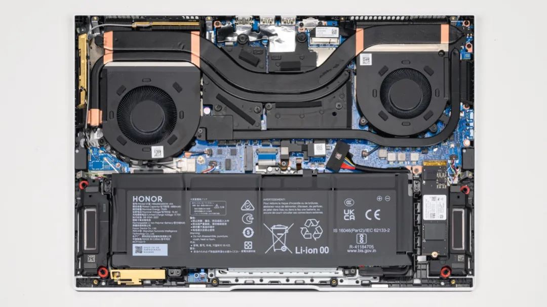 上图是荣耀 MagicBook 16 Pro的拆机实拍图,4热管双风扇的组合,其中一根隐藏在显卡散热模组背面。