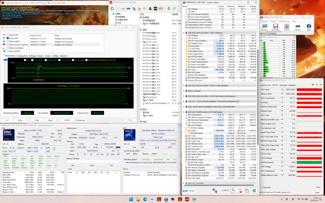 保持默认最大转速将机身垫起后双烤,CPU温度78℃,GPU温度74.6℃,功耗不变,整体区别不大,说明这台电脑几乎不存在进风瓶颈,散热设计合理。