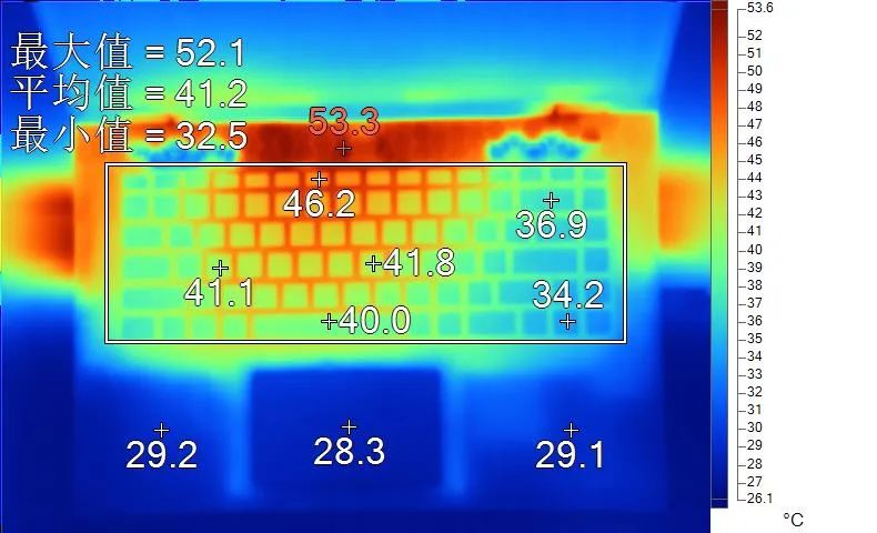 表面温度如上图所示,键盘键帽最高46.2℃出现在功能键“F6”键上,WASD键附近约为41.1℃,方向键34.2℃。左腕托温度为29.2℃。