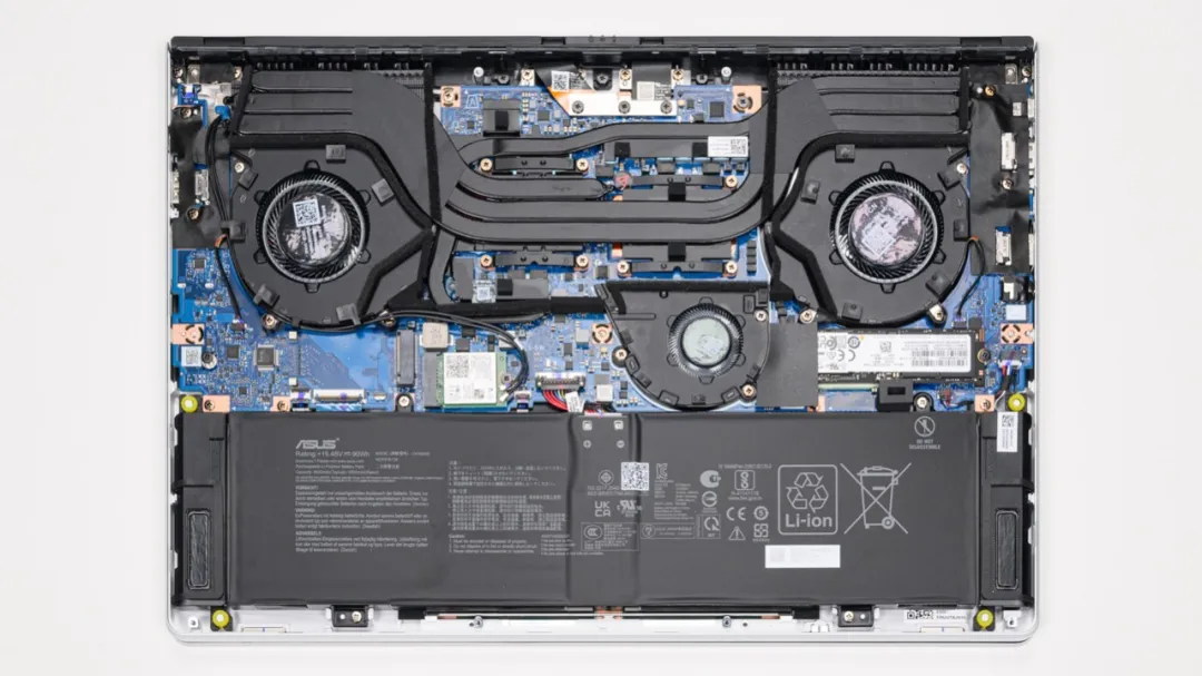 上图是ROG 幻16 Air的拆机实拍图,三风扇四热管,官方称其为“纤维网状散热管”,鳍片后方有导流槽。CPU采用液金导热,主风扇内侧有开口,组成“内吹”结构。