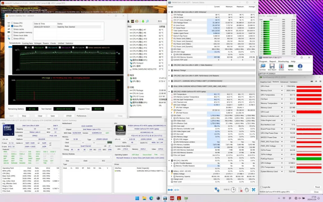 在满载状态下,开启增强模式,CPU温度最高96℃,稳定在88℃左右,功耗33W,P核频率2.0GHz左右,E核2.0GHz,LPE核2.5GHz。显卡功耗87W,温度83.1℃,频率1755MHz。