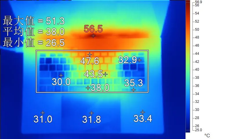 表面温度如上图所示,键盘键帽最高47.6℃出现在功能键“F6”键上,WASD键附近约为30.0℃,方向键35.3℃。左腕托温度为31.0℃。
