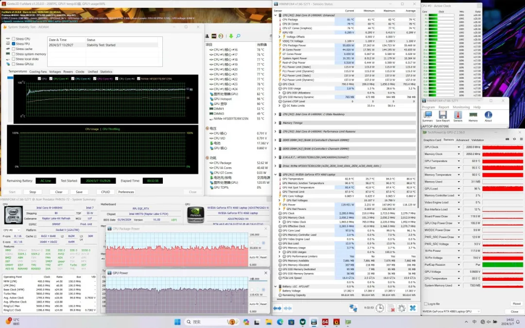 在满载状态下,开启极速模式,CPU温度最高82℃,稳定在81℃左右,功耗56W,P核频率2.0GHz左右,E核1.7GHz;