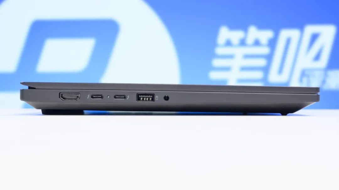 接口方面,机身左侧依次为HDMI2.0、两个雷电4(均支持100W PD充电与DP1.4视频输出)、USB-A 5Gbps和3.5mm音频接口;