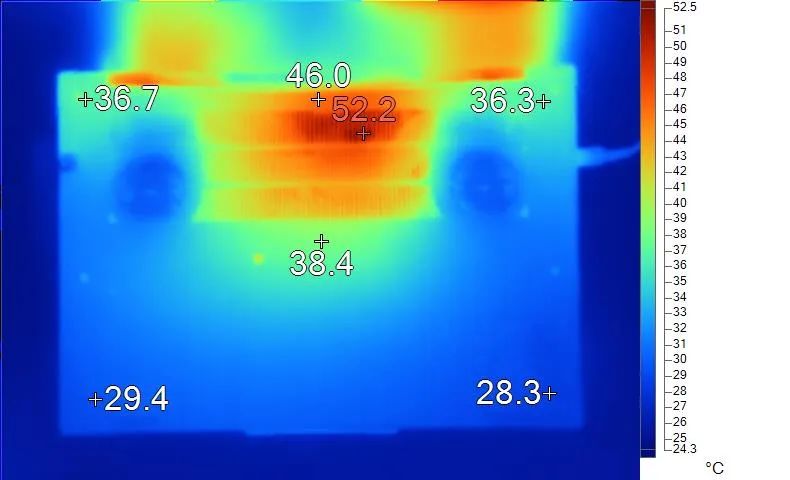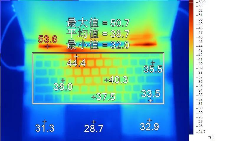 表面温度如上图所示,键盘键帽最高44.4℃出现在功能键“F5”上,WASD键为38.0℃,方向键33.5℃。左腕托温度为31.3℃,背面中心点38.4℃。