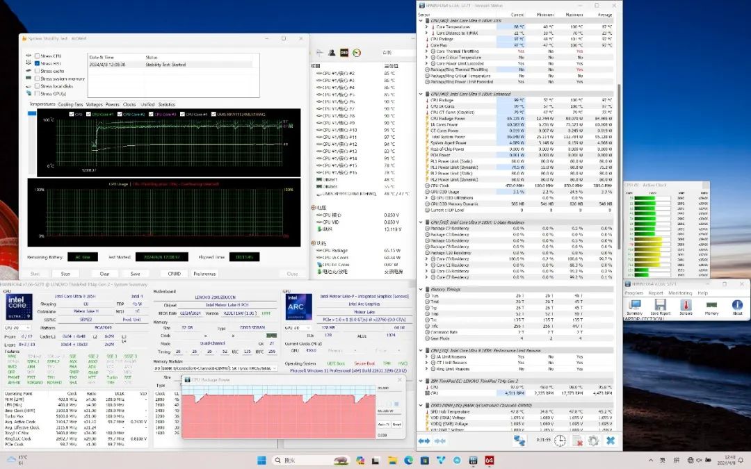 在满载状态下,CPU温度最高100℃,稳定在99℃,功耗大部分时间维持在65W,偶尔会掉到54W,P核频率维持在3.5~3.9GHz,E核频率2.9~3.0GHz。
