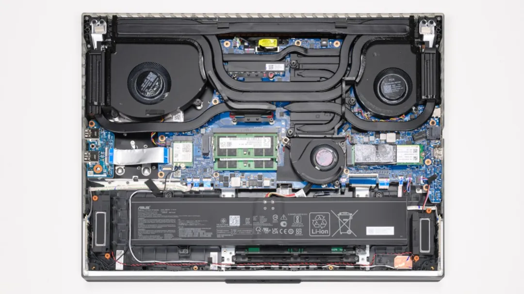 上图是ROG 枪神8 PLUS 超竞版的拆机实拍图,7热管3风扇加大体积鳍片的组合,散热规格和上一代一致。