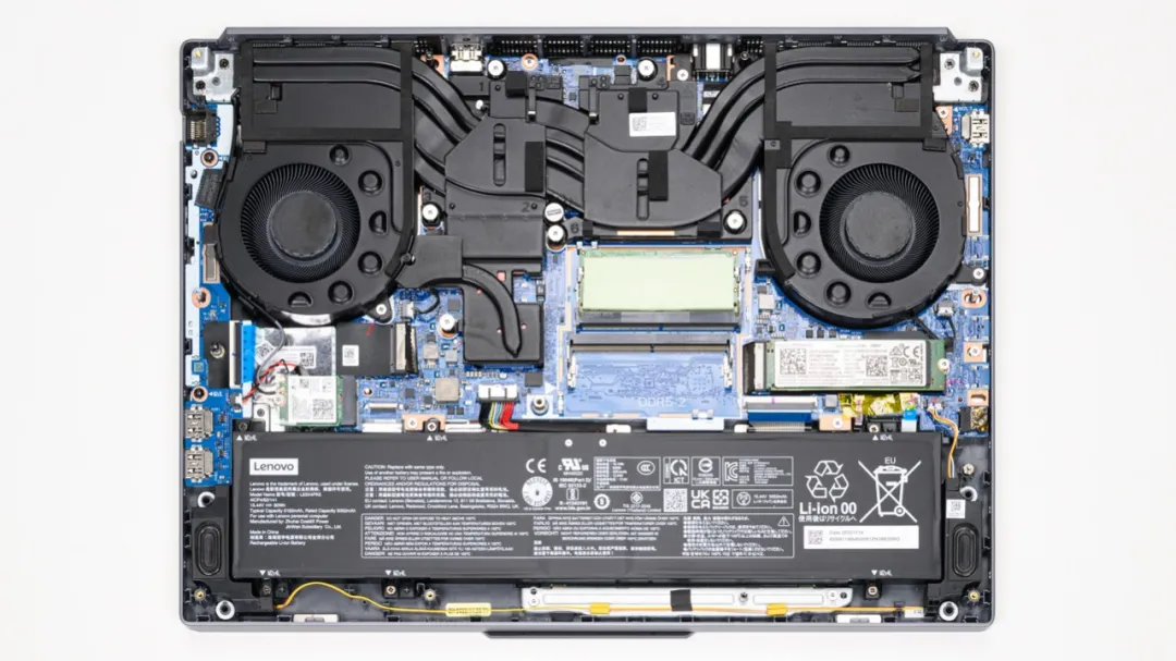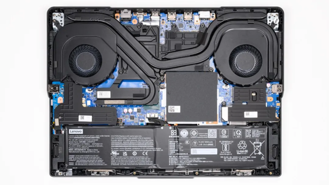 上图是联想 拯救者Y9000P 2024的拆机实拍图,5热管双风扇的组合,GPU底座背面有一根隐藏热管。