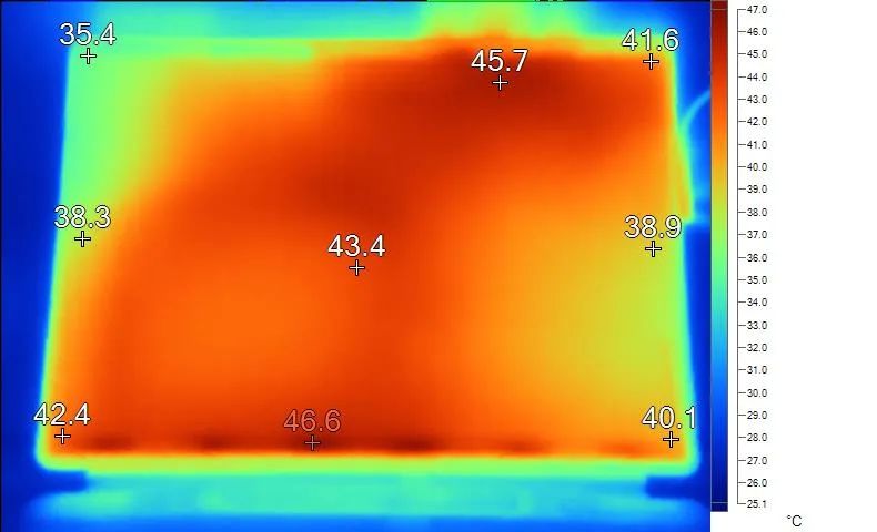 中心点43.4℃,背面最高温度在核心附近,为46.7℃,中心点40.9℃。