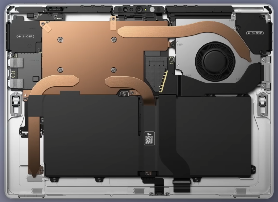 上图是微软 Surface Pro 10的内部示意图,单风扇三热管的组合。