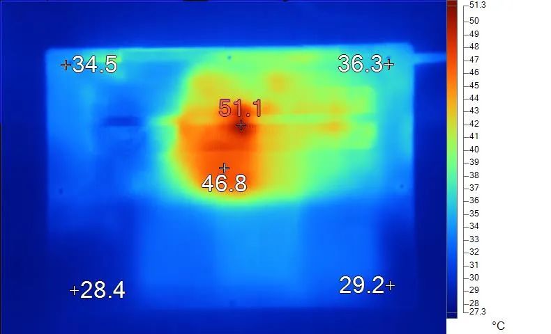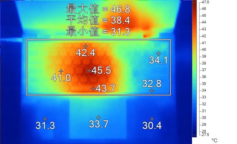 表面温度如上图所示,键盘键帽最高45.5℃出现在“G”键上,WASD键为41.0℃,方向键32.8℃。左腕托温度为31.3℃,背面中心点30.4℃。