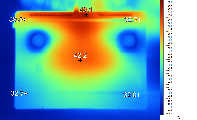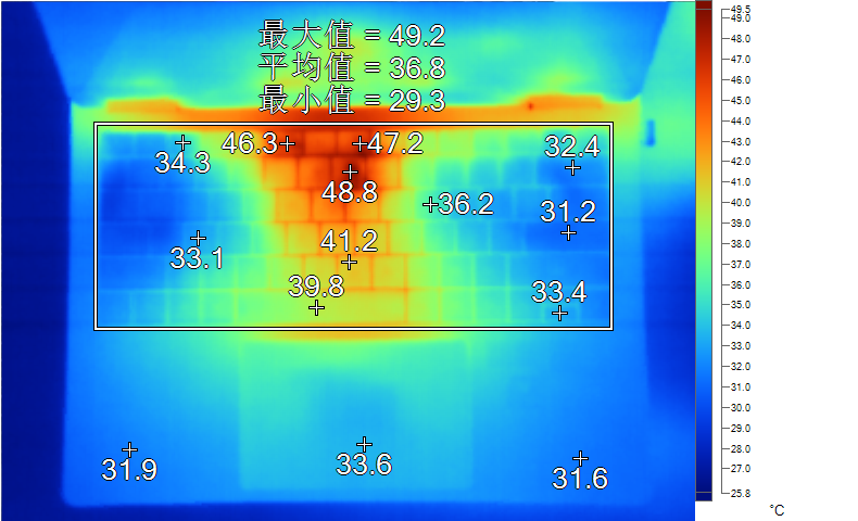 表面温度如上图所示,键盘键帽最高48.8℃出现在“7”键上,WASD键附近约为33.1℃,方向键33.4℃。左腕托温度为31.9℃。底面中心点温度为42.2℃。
