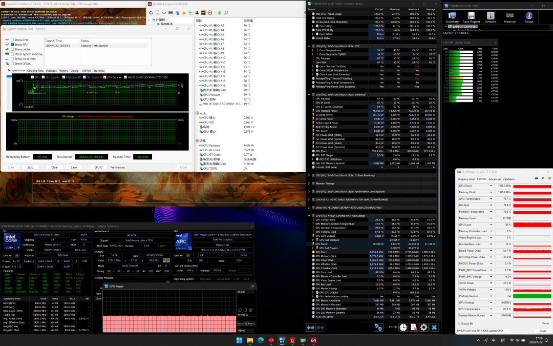 在满载状态下,开启狂暴模式,CPU温度最高101℃,稳定在87℃,功耗45W,P核频率2.7~3.2GHz,E核2.3~2.4GHz;