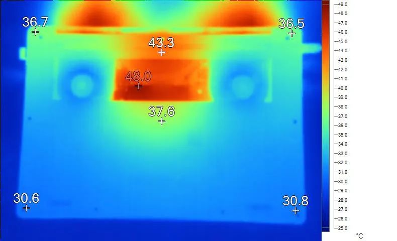 表面温度如上图所示,键盘键帽最高45.9℃出现在“J”键上,WASD键为38.7℃,方向键33.4℃。左腕托温度为32.4℃,背面中心点37.6℃。
