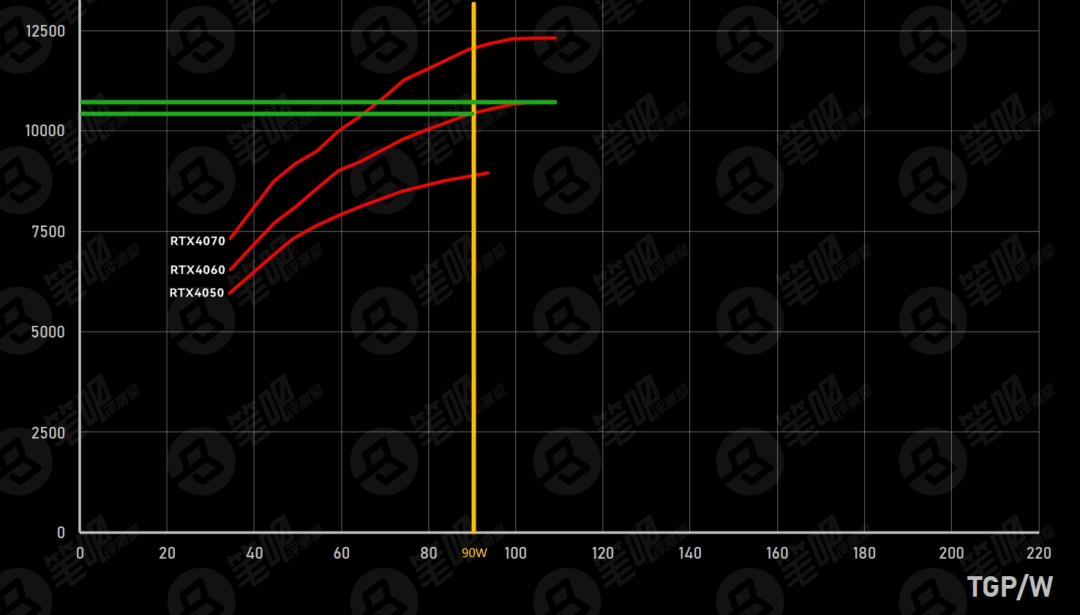 上图是我们做的[笔记本显卡能耗比曲线图],可以看到在100W功耗以上时,显卡的性能就基本没有提升了,而90W的性能虽有下降,但区别真的很小。