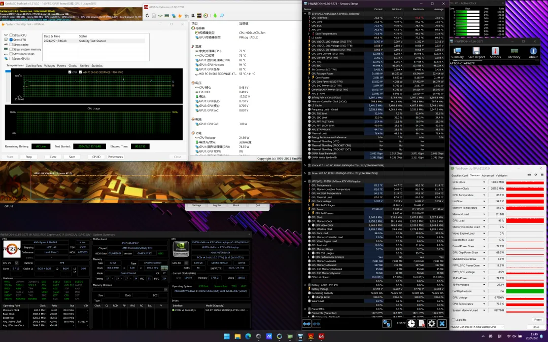 在满载状态下,开启增强模式,CPU温度最高91.6℃,稳定在72.5℃左右,功耗22W,核心频率2.5GHz左右;