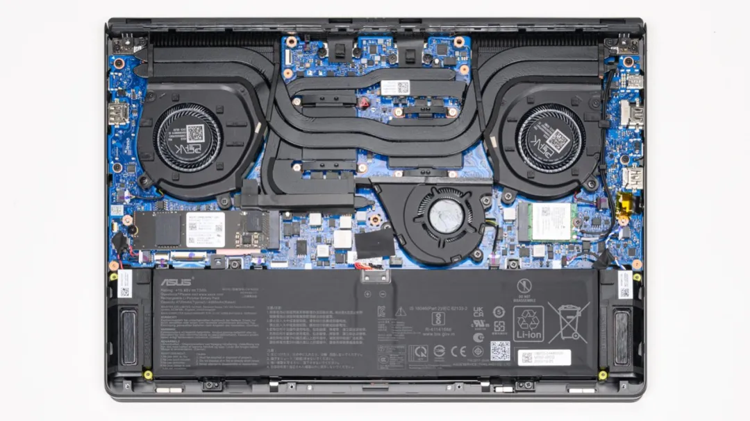 上图是ROG 幻14 Air的拆机实拍图,三风扇+三热管,鳍片后方有导流槽。CPU采用液金导热,主风扇内侧有开口,采用了“内吹”结构。