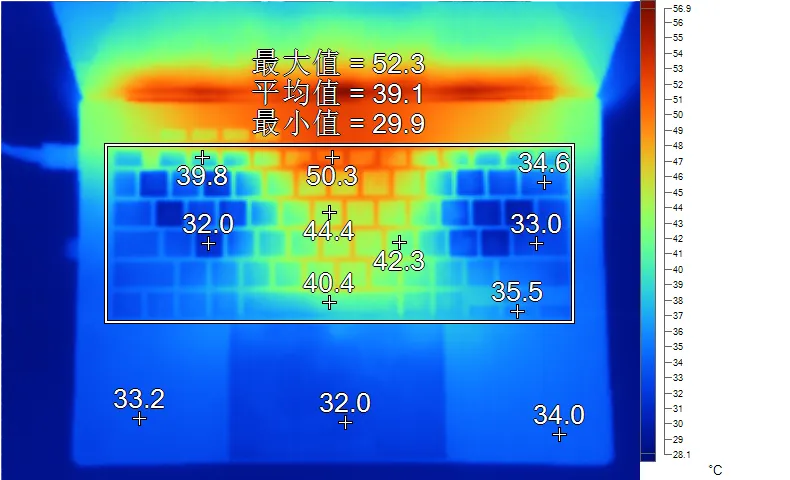 表面温度如上图所示,键盘键帽最高50.3℃出现在“F6”键上,WASD键附近约为32.0℃,方向键35.5℃。左腕托温度为33.2℃。