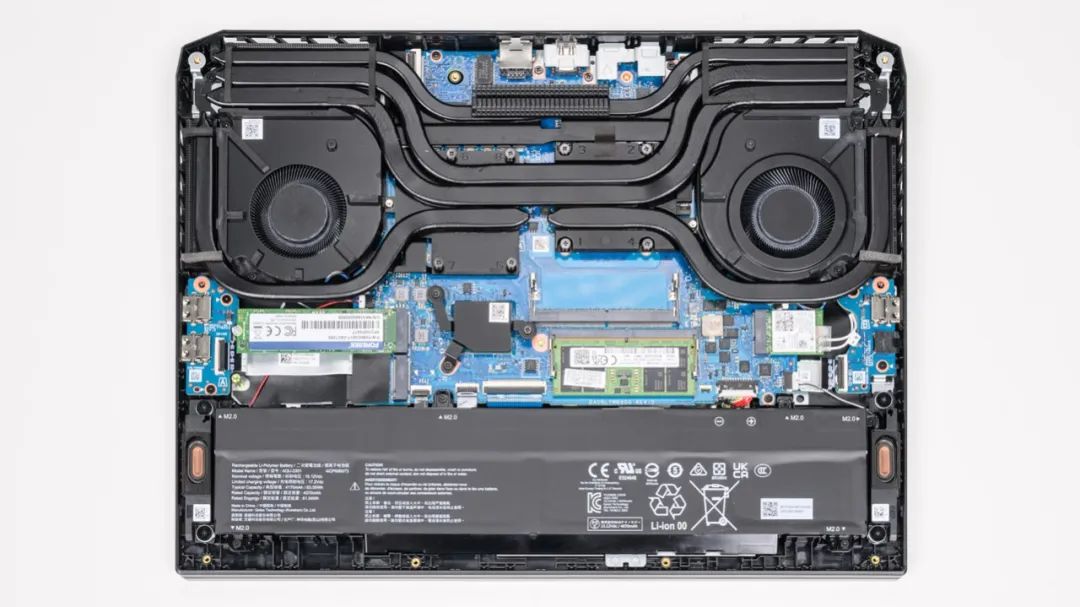 上图是神舟战神 T8Pro的拆机实拍图,5热管双风扇的组合,和之前我们测过的雷神 猎刃16是同模具,但砍掉了原位于PCH上方的小风扇。