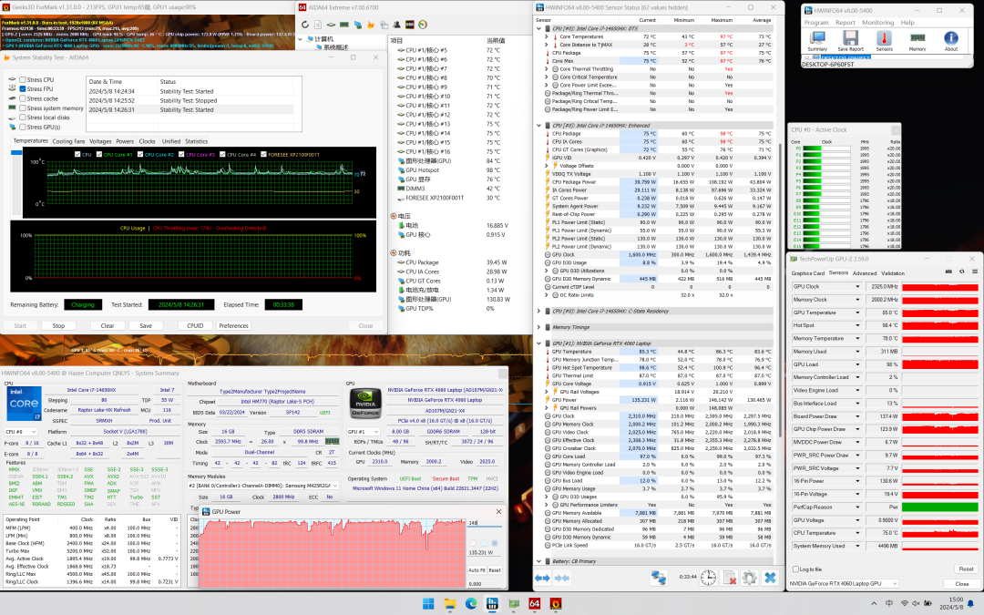 在满载状态下,开启狂暴模式,功耗整体有一定的波动,CPU温度最高98℃,稳定在75℃,功耗40W,P核频率2.0GHz,E核1.8GHz;