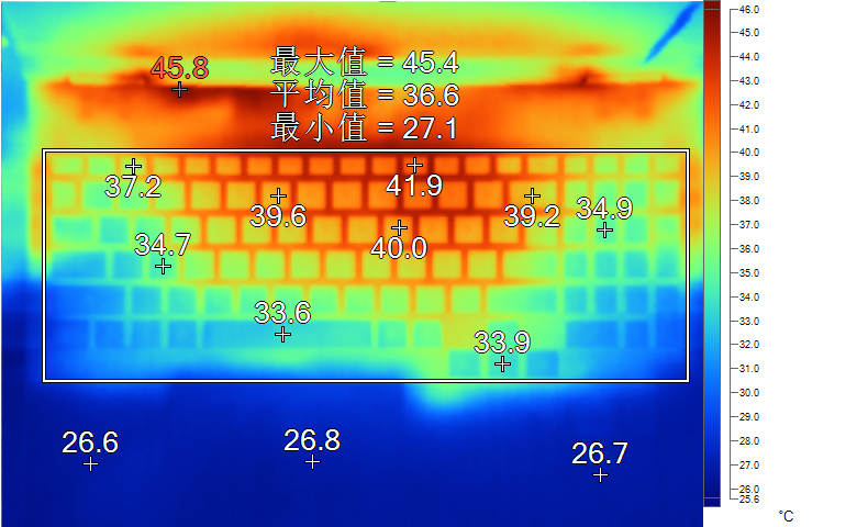 表面温度如上图所示,键盘键帽最高41.9℃出现在“F11”键上,WASD键附近约为34.7℃,方向键33.9℃。左腕托温度为26.6℃。