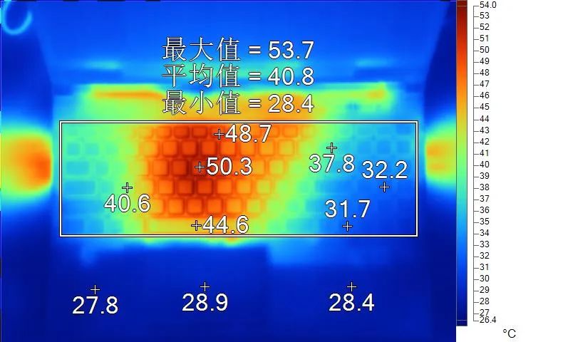 表面温度如上图所示,键盘键帽最高50.3℃出现在“T”键上,WASD键附近约为40.6℃,方向键31.7℃。左腕托温度为27.8℃。