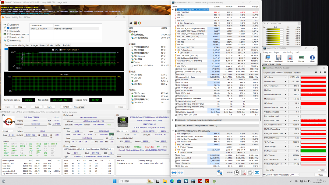 在满载状态下,开启狂暴模式,CPU温度最高98.9℃,稳定在98.0℃,功耗43W,频率3.5GHz;