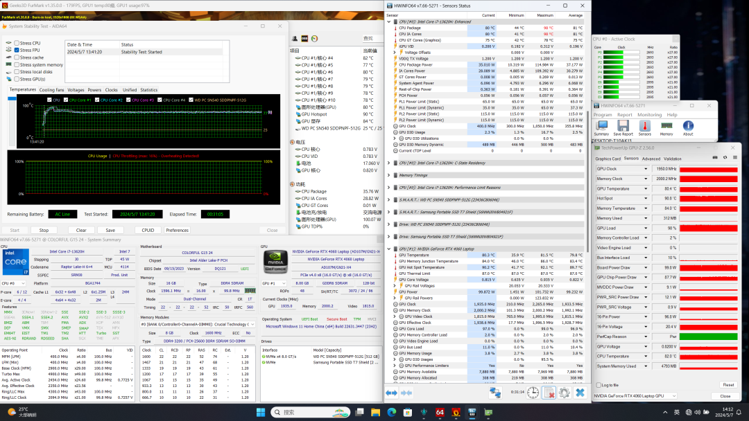 在满载状态下,开启狂暴模式,CPU温度最高98℃,稳定在80℃,功耗35W,P核频率2.7GHz,E核2.1GHz。显卡温度80.3℃,功耗100W,频率 1950MHz。