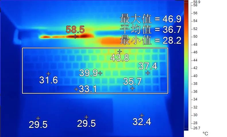 表面温度如上图所示,键盘键帽最高43.8℃出现在键盘右上角,WASD键附近约为31.6℃,方向键35.7℃。左腕托温度为29.5℃。
