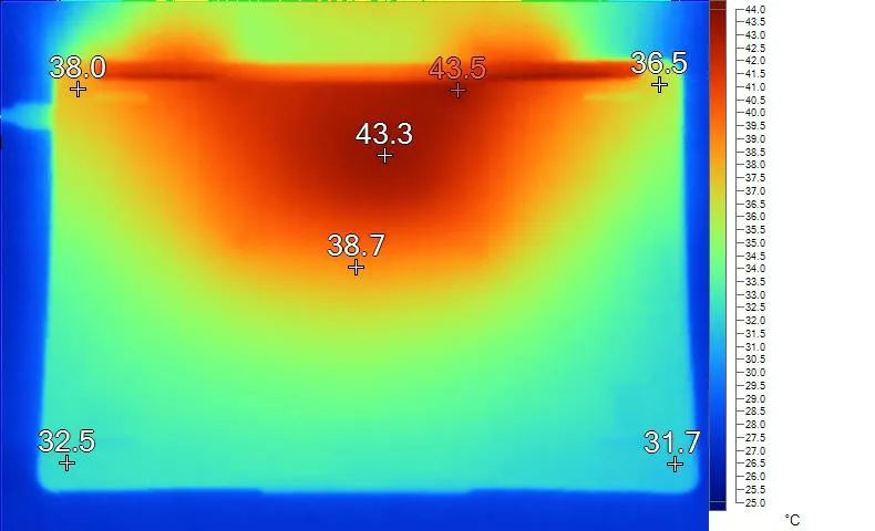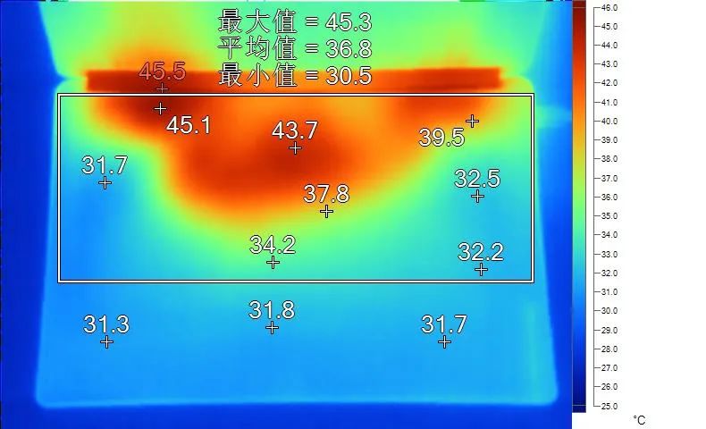 表面温度如上图所示,键盘键帽最高45.1℃出现在“F3”键上,WASD键为31.7℃,方向键32.2℃。左腕托温度为31.3℃,背面中心点38.7℃。
