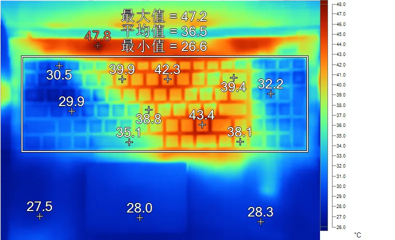表面温度如上图所示,键盘键帽最高43.4℃出现在“?”键上,WASD键附近约为29.9℃,方向键38.1℃。左腕托温度为27.5℃。