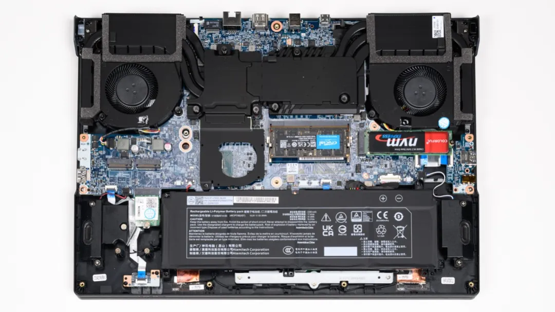 上图是隐星P16 TA的拆机实拍图,6热管双风扇的组合,采用蓝天V360SNxQ模具,七彩虹去掉了一个小风扇同时定制了外壳图案。