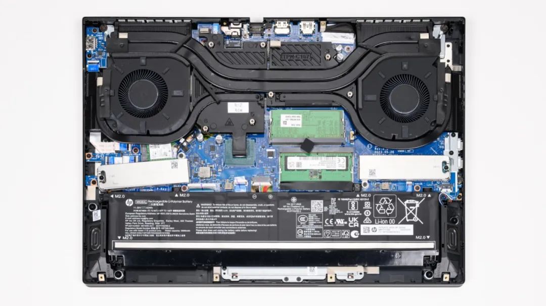 上图是OMEN 暗影精灵10的拆机实拍图,五热管双风扇的组合,其中一根热管隐藏在左侧散热模组下方。