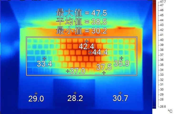 表面温度如上图所示,键盘键帽最高44.4℃出现在“P”键上,为,WASD键附近约为33.4℃,方向键37.5℃。左腕托温度为29.0℃。