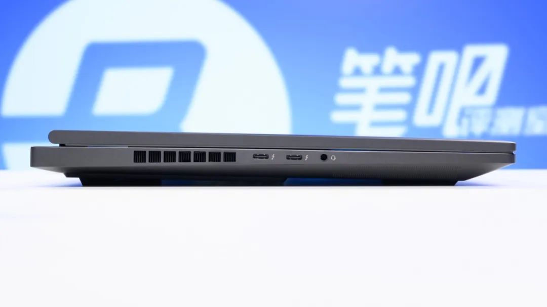 接口方面,机身左侧为两个雷电4(均支持100W PD充电与DP1.4独显视频输出)和3.5mm音频接口;