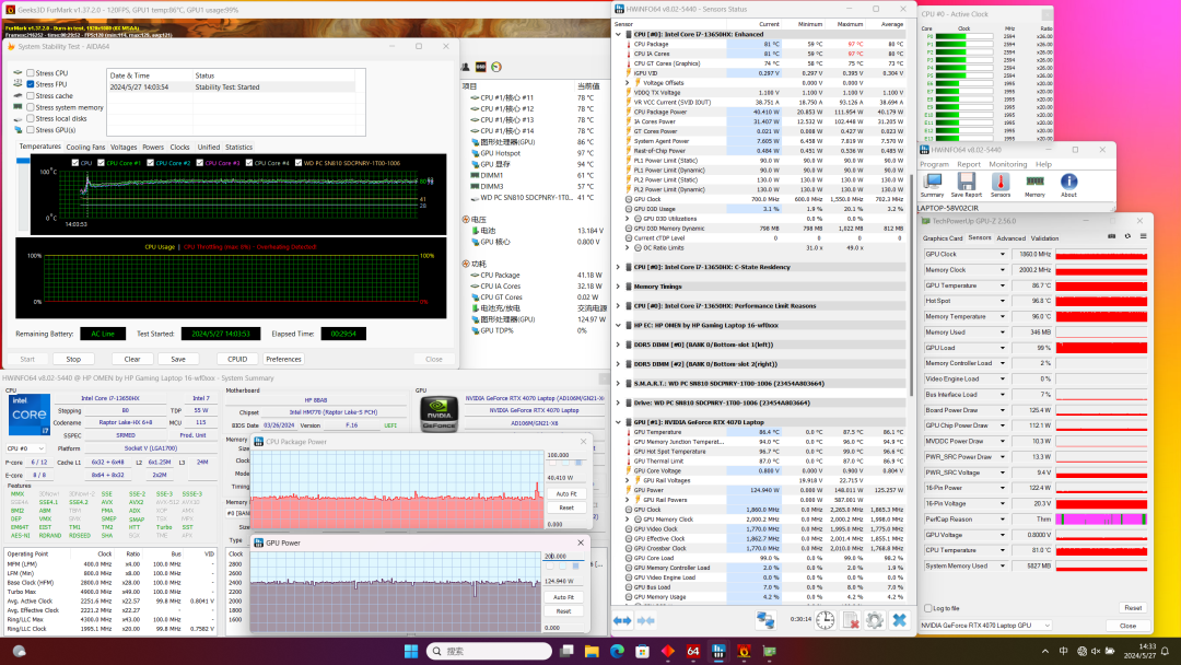 在满载状态下,开启狂暴模式,CPU温度最高97℃,稳定在81℃,功耗40 W,P核频率2.6GHz,E核2.0GHz;