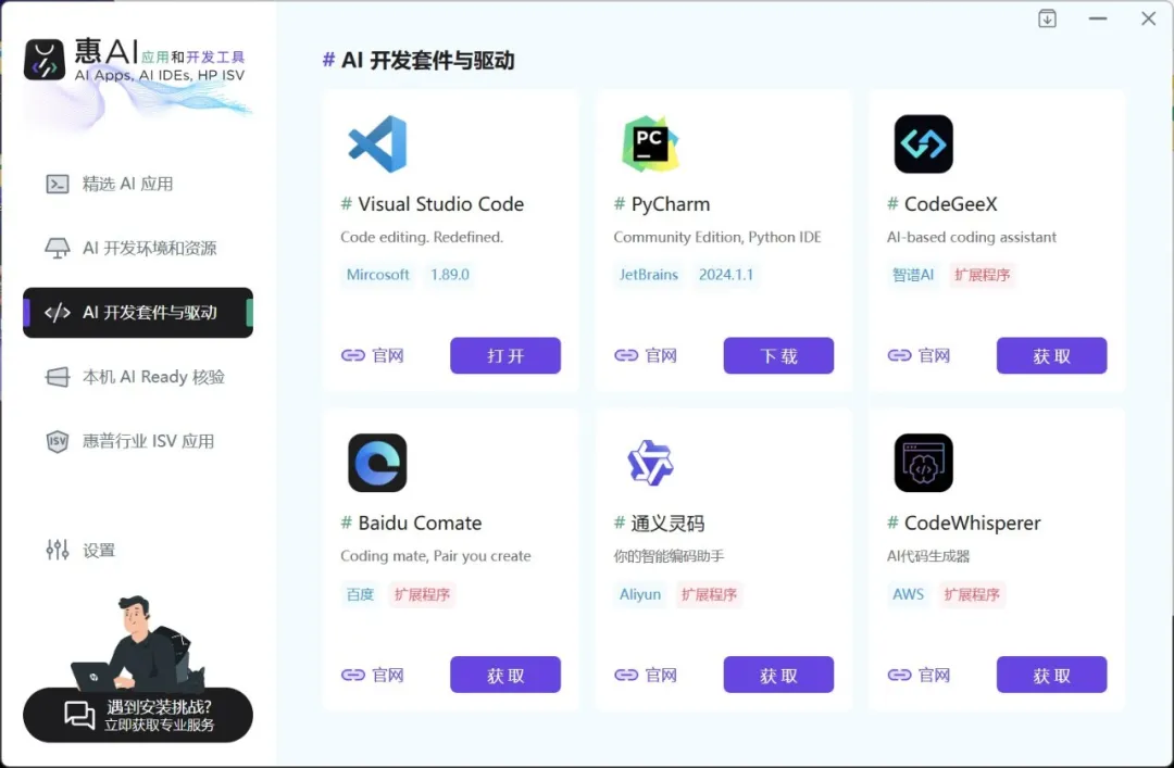 和之前的战系列笔记本一样,惠普也为这台机器预装了惠AI应用商店,能够方便安全地下载运行一些常用AI应用,程序员的开发环境和工具,对新手&小白来说操作更友好。