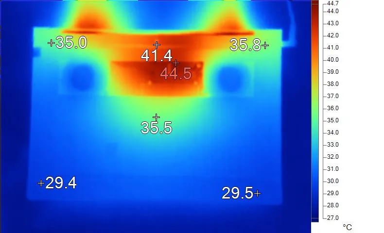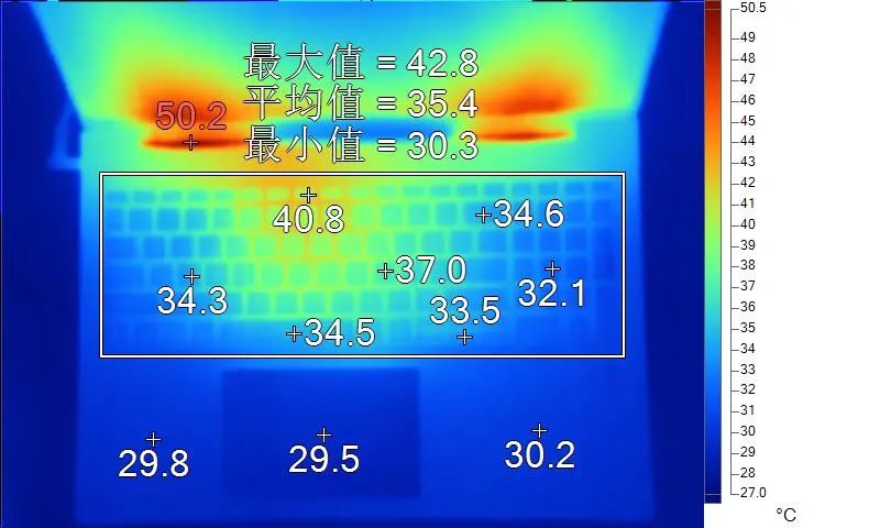表面温度如上图所示,键盘键帽最高40.8℃出现在功能键“F7”上,WASD键为34.3℃,方向键33.5℃。左腕托温度为29.8℃,背面中心点35.5℃。