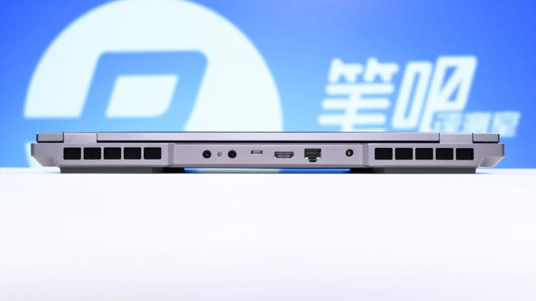 机身后侧有一个雷电4接口(支持100WPD充电和DP核显视频输出),一个HDMI2.1接口(独显输出)以及一个RJ45网线接口和电源接口。