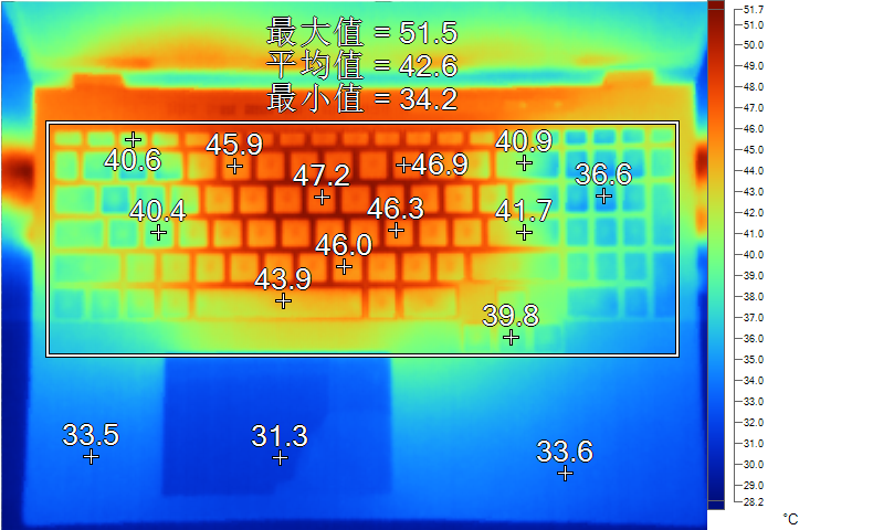 表面温度如上图所示,键盘键帽最高47.2℃出现在“U”键上,WASD键附近约为40.4℃,方向键39.8℃。左腕托温度为33.5℃。