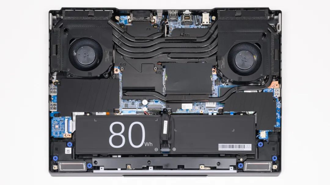 上图是机械革命 耀世16Super的拆机实拍图,6热管双风扇加双液金的组合。