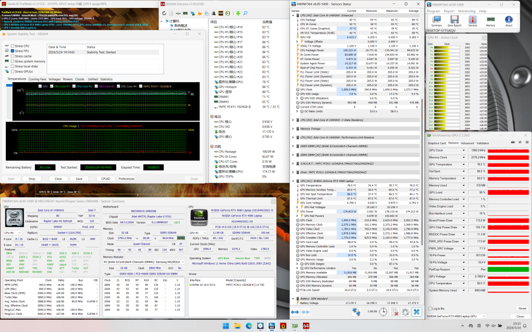手动开启强冷后再次进行测试:CPU功耗来到80W左右,温度墙放宽到95℃,显卡功耗175W,温度87.2℃,在降频线边缘。