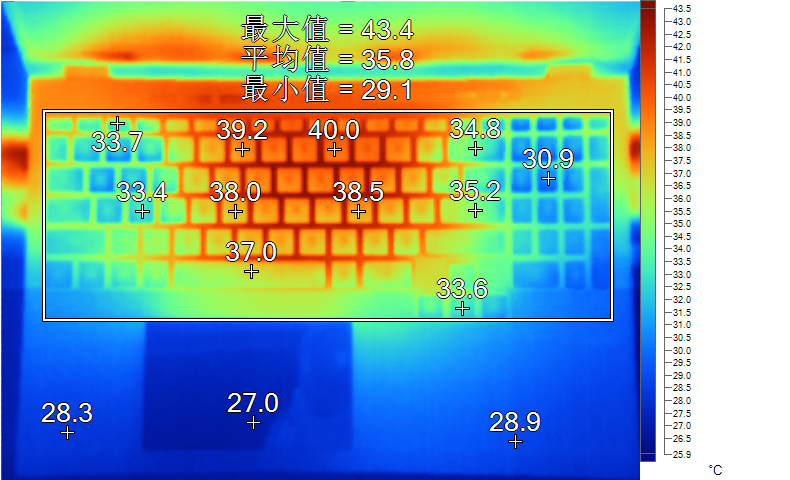 由于此时风扇转速太低,所以表面温度整体偏高,如果手动开启强冷表现会好很多,键帽最高温度会下降到40.0℃,如下图: